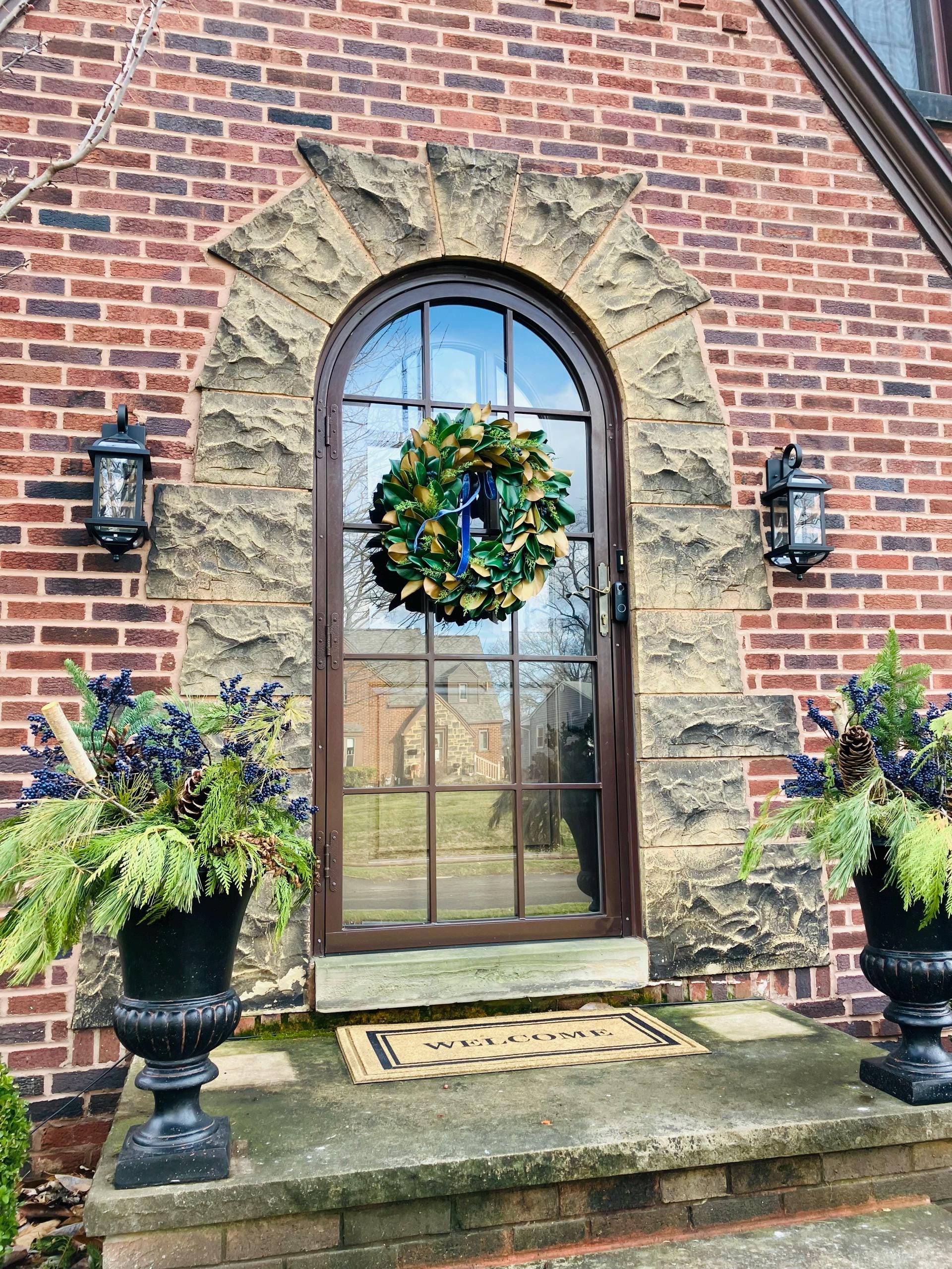 This wreath is absolutely gorgeous! Seller was so kind, and even made it a bit fuller for me. She included a sweet card in the package. It was packed very well for protection during shipping. The velvet ribbon adds a beautiful touch! Couldn’t love this more for my winter door decor! Such high quantity! ❤️